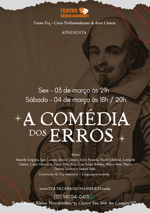 Espetáculo “A Comédia dos Erros” – 03 e 04 de março – Horário: sexta às 21h e sábado às 18h/20h (2 sessões).