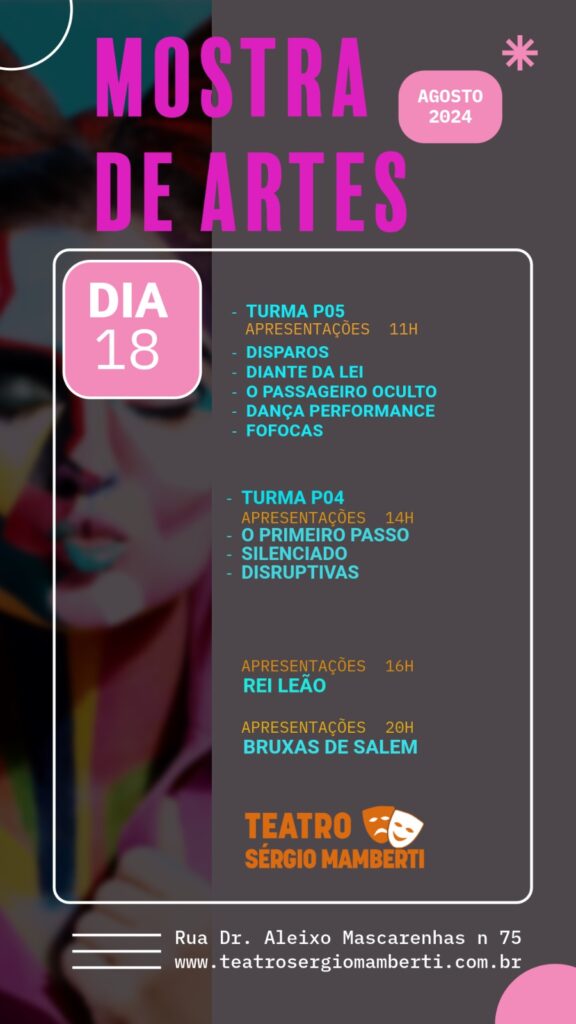 É com grande entusiasmo que convidamos vocês para a nossa Mostra de Artes, onde nossos talentosos alunos apresentarão seus trabalhos de conclusão de semestre. Venham prestigiar nossos futuros atores e celebrar o talento e a dedicação!